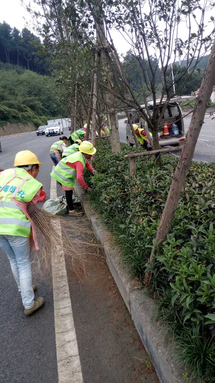 南二環中央綠化帶修枝剪葉綠化環境維護工作正在進行中,圖為金海綠化養護隊工作中。